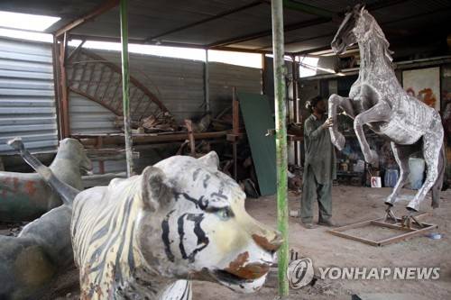epa08937248 A man works on a sculpture made up of fiber glass at a workshop on the outskirts of Islamabad, Pakistan, 14 January 2021. These sculptures are sold in the market at a price range between 120 USD upto 8000 USD depending on the dimensions, quality and artwork. Mostly zoo owners, housing societies and home owners buy it to decorate their place. EPA/SOHAIL SHAHZAD