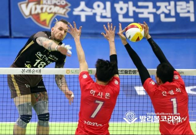 【발리볼코리아닷컴(수원)=김경수 기자】 14일(목) 경기도 수원시 수원실내체육관에서 열린 프로배구 2020-2021 V리그 4라운드 남자부 한국전력 vs OK금융그룹 수원경기에서 OK금융그룹 펠리레의 후위공격을 한국전력 이시몬과 신영석이 블로킹하고 있다. 2021. 1. 14.