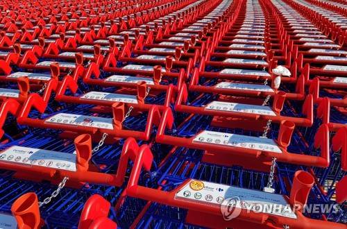 epa08937257 Shopping trolleys stand in line at a Carrefour supermarket at Nice, France, 14 January 2020. Canadian group Couche-Tard offers to buy Carrefour for 16 billion euros. EPA/SEBASTIEN NOGIER