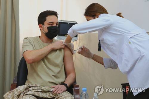 epa08937268 A handout photo made available by Royal Hashemite Court shows Jordanian Crown Prince Al Hussein receiving COVID-19 vaccine at the Royal Medical Services Clinic at the Royal Hashemite Court, Amman, Jordan, 14 January 2021. EPA/ROYAL HASHEMITE COURT HANDOUT HANDOUT EDITORIAL USE ONLY/NO SALES