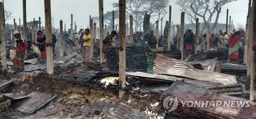 Rohingya refugees walk in the charred remains after a fire broke out in Nayapara Camp in Cox's Bazar district, Bangladesh, Thursday, Jan. 14, 2021. A fire raced through a sprawling Rohingya refugee camp in southern Bangladesh on Thursday, destroying hundreds of homes, officials said. No casualties were reported. The UNHCR said more than 550 homes sheltering about 3,500 people as well as 150 shops were either totally or partially destroyed in the fire. (AP Photo/Mohammed Faisal)
