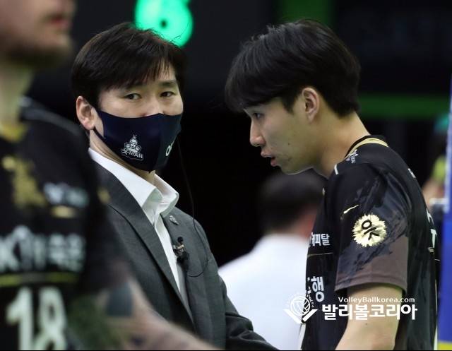 【발리볼코리아닷컴(수원)=김경수 기자】 14일(목) 경기도 수원시 수원실내체육관에서 열린 프로배구 2020-2021 V리그 4라운드 남자부 한국전력 vs OK금융그룹 수원경기에서 OK금융그룹 석진욱감독이 세터 이민규에게 작전을 지시하고 있다. 2021. 1. 14.