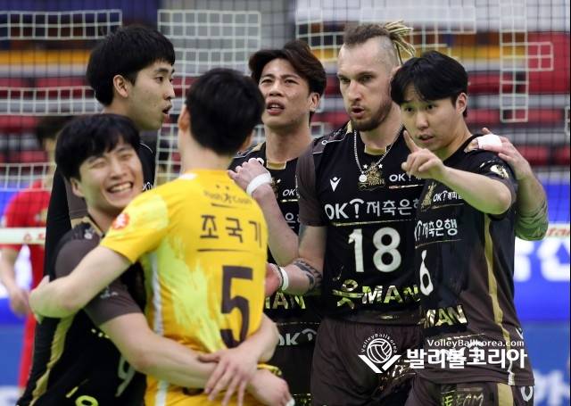 【발리볼코리아닷컴(수원)=김경수 기자】 14일(목) 경기도 수원시 수원실내체육관에서 열린 프로배구 2020-2021 V리그 4라운드 남자부 한국전력 vs OK금융그룹 수원경기에서 OK금융그룹 선수들이 공격을 성공시키고 기뻐하고 있다. 2021. 1. 14.