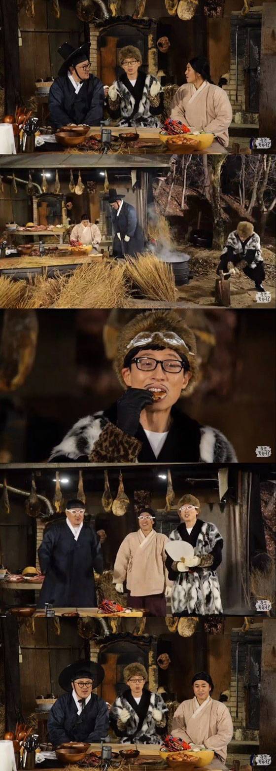 이날 유재석은 산적, 데프콘은 선비, 김종민은 머슴 옷을 입고 등장해 초반부터 웃음을 안겼다. '밥 한번 먹자' 인 만큼 세 사람은 가마솥 밥, 부대찌개, 고기까지 다양한 먹방을 예고했다.