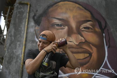 Street artist Wolfgang Salazar mixes spray paint backdropped by his most recent art mural featuring Venezuelan athlete Yulimar Rojas, in the Boleita neighborhood of Caracas, Venezuela, Saturday, Jan. 2, 2021. Salazar uses the artistic name of Badsura, a play on the English word “bad” and the Spanish word “basura," for “garbage,” (AP Photo/Matias Delacroix) JAN. 2, 2021 PHOTO