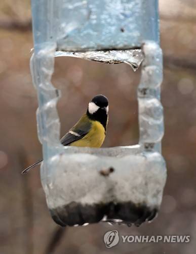 epa08937418 A titmouse is fed in the 'Arkonski' forest in Szczecin, Poland, 14 January 2021. EPA/Marcin Bielecki POLAND OUT