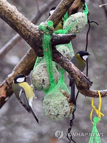 epa08937415 Titmouses are fed in the 'Arkonski' forest in Szczecin, Poland, 14 January 2021. EPA/Marcin Bielecki POLAND OUT