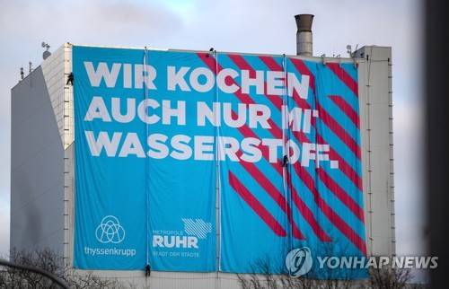 epa08937670 High-altitude climbers hang a banner with the inscription 'We also only cook with hydrogen' on the ThyssenKrupp steel plant in Bochum, Germany, 14 January 2021. According to the steel manufacturer thyssenkrupp, a feasibility study on steel production with hydrogen has shown that the entire value chain can be converted to more climate-friendly processes around 2027. EPA/FRIEDEMANN VOGEL
