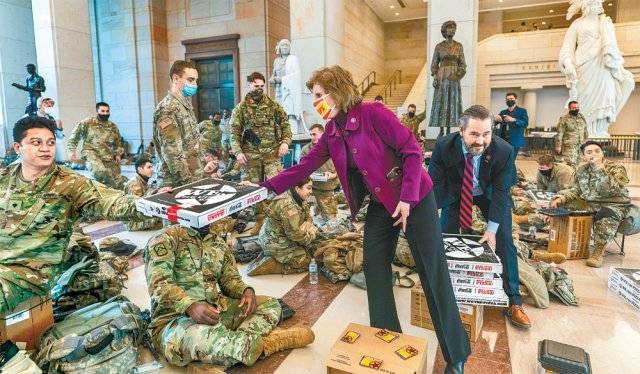 | 탄핵 투표 날… 의사당 경계 주방위군에 피자 쏜 공화당 의원들 13일(현지 시간) 미국 워싱턴 국회의사당에서 하원이 도널드 트럼프 대통령 탄핵소추안 표결을 진행한 가운데 비키 하츨러 하원의원(공화당·미주리·가운데)과 마이클 왈츠 하원의원(공화당·플로리다·오른쪽)이 의회 보안 강화를 위해 파견된 주방위군에게 피자를 돌리고 있다. 두 의원은 탄핵안에 반대표를 던졌다. 6일 의회 난입 사태의 여파로 이날 의회에는 약 1만5000명의 주방위군이 파견됐다. 워싱턴=AP 뉴시스 |