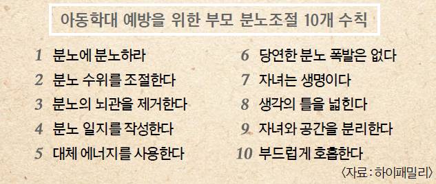 생각의 틀 넓히기, 자녀와 공간 분리하기, 부드러운 호흡으로 숨쉬기 등도 주요 수칙으로 제시됐다.