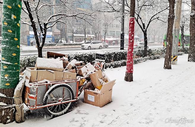 | ▲ 지난 12일 오후, 눈이 내린 서울 시내의 모습. 거리 한편에 놓인 재활용품 수집 리어카에도 하얗게 눈이 쌓였다. |