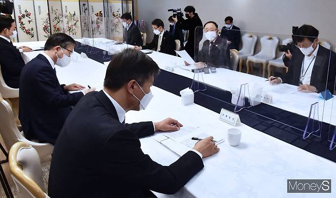 홍남기 경제부총리 겸 기획재정부 장관이 15일 서울 종로구 세종대로 정부서울청사 국무위원식당에서 열린 제13차 부동산시장 점검 관계장관회의에 참석, 발언하고 있다.