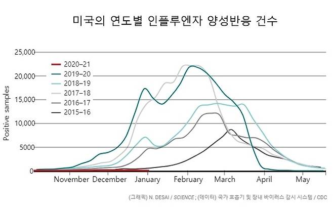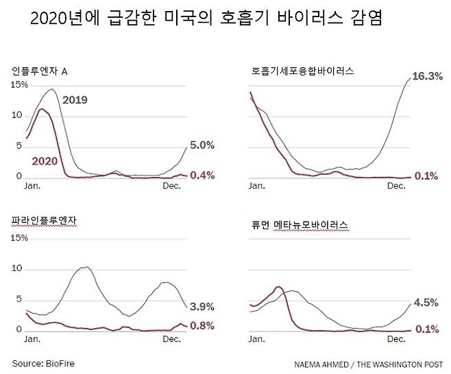 미국 질병통제예방센터 국내인플루엔자감시팀장 리네트 브래머는 최근 `워싱턴포스트' 인터뷰에서 "올해 30년째 인플루엔자를 지켜보고 있지만 이렇게 적게 발생하리라고는 예상치 못했다"고 말했다. 센터 통계에 따르면 코로나19 발생 직전인 2019년 12월 셋쨋주의 경우, 검사 의뢰를 받은 2만9578건 중 16.2%에서 인플루엔자A 양성반응이 나왔다. 1년후인 2020년 12월 셋쨋주에는 그 비율이 0.3%에 불과했다. 2020년 마지막주의 인플루엔자 사망자는 5명으로 한 해 전의 40분의1, 2017년의 130분의1 수준이다.