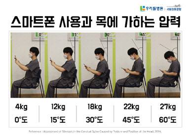 스마트폰을 보면서 고개를 최대 60도까지 굽히면 경추에는 최대 약 27㎏의 하중이 가해지게 되며, 이는 초등학교 저학년 아이를 목에 태운 상태와 같은 하중을 견디고 있다고 볼 수 있다.