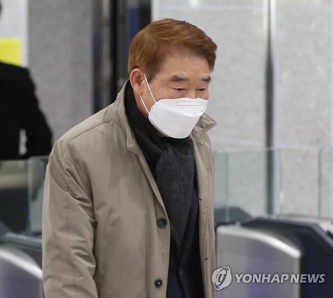 (울산=연합뉴스) 김용태 기자 = 공직선거법 위반 혐의로 재판에 넘겨진 정천석 울산 동구청장이 15일 오전 울산지법에서 직위 상실형에 해당하는 벌금 500만원을 선고받은 후 법원을 떠나고 있다. 2021.1.15