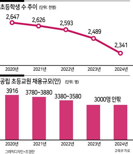 이에 따라 공립 초등학교 신규 교원 채용 숫자는 당장 올해부터 100명이 추가로 줄고 오는 2023년과 2024년에는 900명 가량이 추가로 더 줄어들 전망이다.