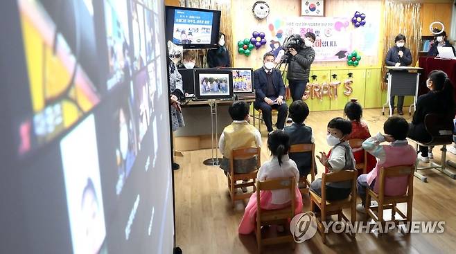 (김해=연합뉴스) 김동민 기자 = 15일 경남 김해시 대중초등학교에서 열린 초교·병설 유치원 비대면 졸업 및 수료식에서 유치원 수료생이 교실 뒤에 설치된 모니터를 통해 가족을 바라보고 있다.