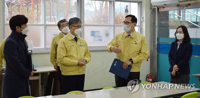 (서울=연합뉴스) 정종철 교육부 차관이 15일 충남 공주고등학교를 방문해 운동부의 신종 코로나바이러스 감염증(코로나19) 방역 상황을 점검하고 있다. 2021.1.15