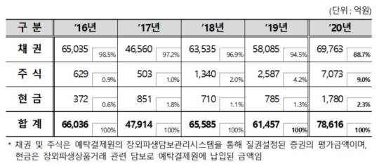 장외파생상품 거래에 대한 담보로는 채권이 6조9,763억원으로 전체의 88.7%를 차지했다. 그 뒤로는 상장주식(9%), 현금(2.3%) 등 순이었다. 국고채 담보 채권 규모는 5조7,986억원, 통안채는 9,211억원 수준이었다.