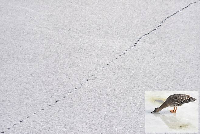 한강이 결빙되고 폭설 내린 다음날 풍경, 한강을 찾아와 겨울을 나던 기러기 한마리가 눈길을 걸어서 강변 눈 녹은 물을 찾아가 목을 축이고 있다. 한강 물과 함박눈이 모두 물이지만 정작 먹을 수 있는 물이 없어졌던 것이다. 그렇다, 물은 곧 생명이다. 그 많던 물도 하루아침에 마실 수 없게 되는 경우가 있듯 지구온난화와 기후변화를 막아 지구의 생명을 늘리지 않으면 우리 곁 모든 생명의 시간도 그만큼 단축될 수 있다는 것을 알아차리자. 사진가