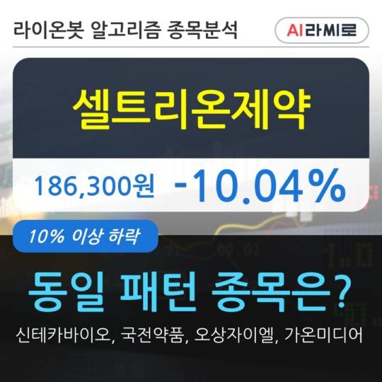 이 시각 거래소에서 셀트리온제약 이외에도 신테카바이오(-12.34%), 국전약품(-12.51%), 오상자이엘(-15.17%), 가온미디어(-10.22%)가 하락세를 보이고 있다.