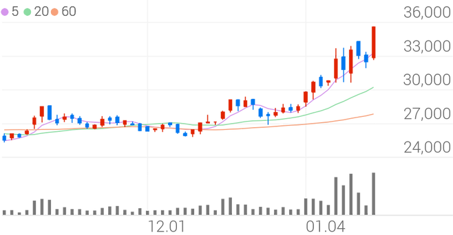 한화에어로스페이스(012450)가 52주 신고가를 경신했다. 전일 대비 11.38% 상승한 36,200원에 거래되고 있다.