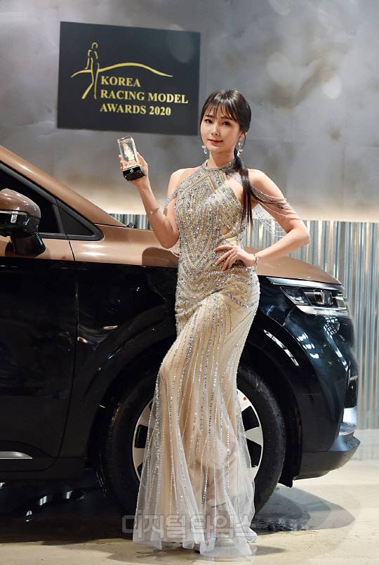 레이싱모델 박지은이 경기도 성남시 더 헤리티지에서 진행된 '2020 한국 레이싱모델 어워즈(2020 Korea Racing Model Awards)'에서 '최우수 글로벌 스타상'을 수상, 포즈를 취하고 있다.
