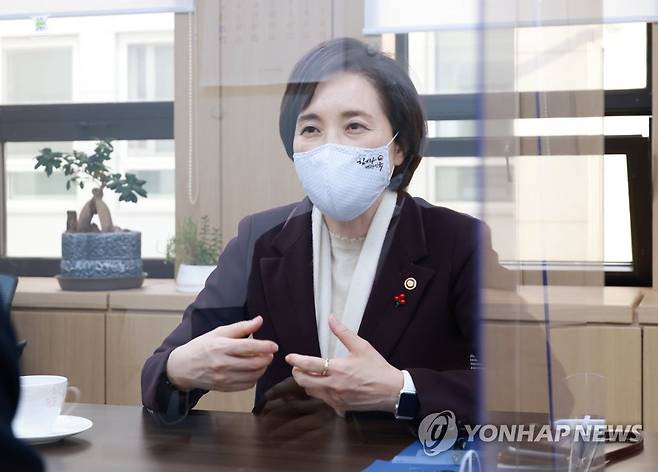 (서울=연합뉴스) 유은혜 사회부총리 겸 교육부 장관이 15일 박종훈 경남도교육감과 경남교육청이 추진하는 방과후학교 자원봉사자의 공무직 전환과 관련해 의견을 나누고 있다. 2021.1.15
