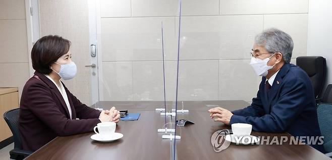 (서울=연합뉴스) 유은혜 사회부총리 겸 교육부 장관이 15일 박종훈 경남도교육감과 경남교육청이 추진하는 방과후학교 자원봉사자의 공무직 전환과 관련해 의견을 나누고 있다. 2021.1.15