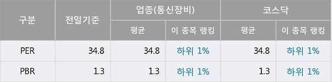 전일 종가를 기준으로 이 종목의 PER는 34.8배, PBR은 1.3배이다. PER는 통신장비업종의 평균 PER 34.8배와 동일한 수준으로 업종 내에서 하위 1%에 있고, PBR은 통신장비업종의 평균 PBR 1.3배와 동일한 수준으로 업종 내에서 하위 1%에 위치한다. 보통 낮은 PER는 현재 시장이 해당 기업의 가치를 상대적으로 낮게 평가하고 있다고 해석될 수 있다.