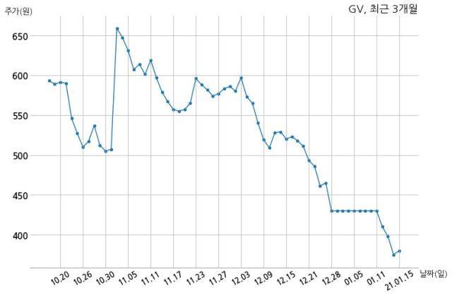 한편, GV의 14시 48분 현재주가는 380원으로 직전 거래일 대비 5원(+1.33%) 상승이며, 거래량은 2,272,944주이다.