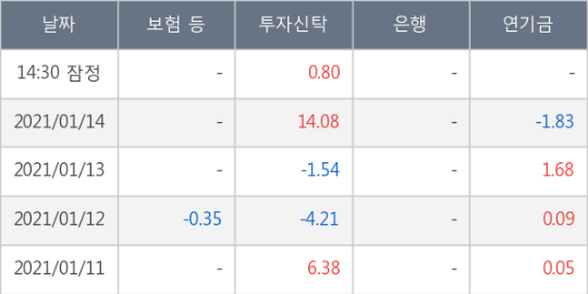14시 30분 잠정집계에 따르면, 외국인은 씨아이에스를 -25,000주 순매도하고 있고 기관은 8,000주 순매수 중이다. 기관 중에 투자신탁의 자금이 유입되었다.