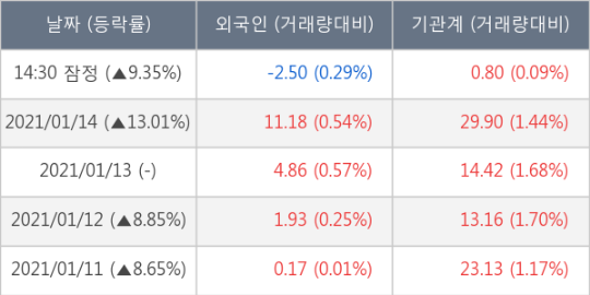 이 시각 거래소에서 씨아이에스 이외에도 에넥스(25.07%), 한솔인티큐브(19.96%), 아바텍(21.06%), 형지엘리트(12.96%), 정다운(11.99%) 등이 상승세를 보이고 있다.