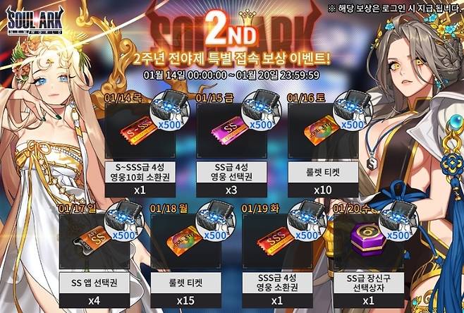 오는 20일까지 진행되는 2주년 전야제 이벤트는 게임에 접속 시 매 요일마다 각종 보상을 제공한다.