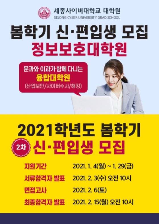 한편, 세종사이버대 정보보호대학원은 2021학년도 봄학기 1차 모집을 성황리에 마치고, 1월 4일(월)부터 1월 29일(금)까지 2차 신·편입생을 모집하고 있으며 다양한 장학 혜택과 함께 특수대학원으로써 학위논문 제출 대신 학점 추가이수로 석사학위 취득이 가능하다.