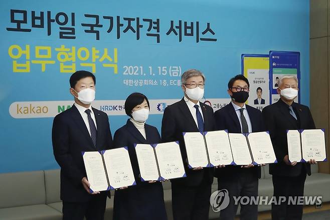 (서울=연합뉴스) 진연수 기자 = 15일 오후 서울 중구 대한상공회의소에서 열린 모바일 국가자격 서비스 업무협약식에서 이재갑 고용노동부 장관과 참석자들이 기념촬영을 하고 있다. 왼쪽부터 우태희 대한상의 상근부회장, 한성숙 네이버 대표, 이재갑 고용부 장관, 여민수 카카오 공동대표, 김동만 산업인력공단 이사장. 2021.1.15