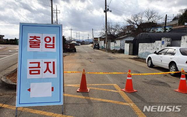 [영암=뉴시스] 박상수 기자 = 15일 오후 마을 주민들이 '코로나19'에 집단 감염된 전남 영암군 도포면의 한 마을 입구에 차량과 주민들의 출입을 금지하는 푯말이 세워져 있다. 2021.01.15. parkss@newsis.com