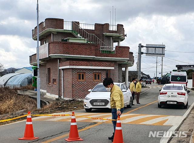[영암=뉴시스] 박상수 기자 = 15일 오후 마을 주민들이 '코로나19'에 감염된 전남 영암군 도포면의 한 마을 입구를 공무원들이 통제하고 있다. 2021.01.15. parkss@newsis.com