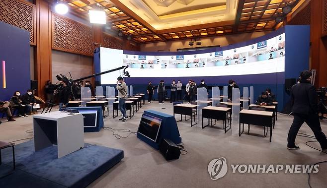 (서울=연합뉴스) 최재구 기자 = 문재인 대통령의 2021 신년 기자회견을 사흘 앞둔 15일 청와대 춘추관에 마련된 기자회견장에서 청와대 및 언론 관계자들이 시설과 방송장비를 설치하고 있다. 2021.1.15