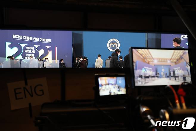 (서울=뉴스1) 이광호 기자 = 문재인 대통령의 신년 기자회견을 사흘 앞둔 15일 청와대 춘추관에서 관계자들이 기자회견장 준비로 분주하다. 이번 신년 기자회견은 신종 코로나바이러스 감염증(코로나19)으로 인한 사회적 거리두기를 고려해 춘추관 현장에서 온·오프라인 화상연결을 통한 방식으로 진행된다.2021.1.15/뉴스1