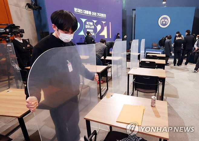 (서울=연합뉴스) 최재구 기자 = 문재인 대통령의 2021 신년 기자회견을 사흘 앞둔 15일 청와대 춘추관에 마련된 기자회견장에서 청와대 및 언론 관계자들이 시설과 방송장비를 설치하고 있다. 2021.1.15