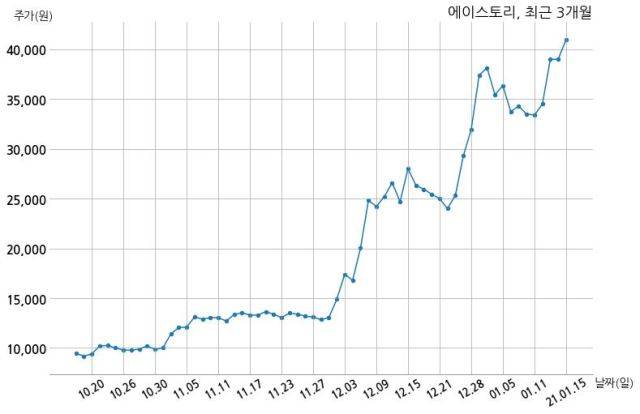 한편, 에이스토리의 15시 27분 현재주가는 41,000원으로 직전 거래일 대비 2,000원(+5.13%) 상승이며, 거래량은 424,785주이다.