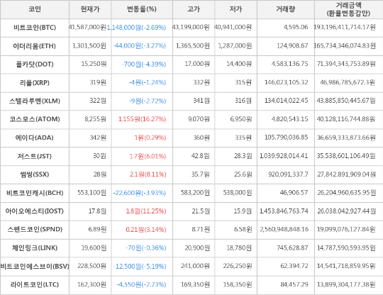 가상화폐 비트코인 -2.69% 하락, 코스모스 16.27% 상승