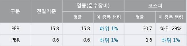 전일 종가를 기준으로 이 종목의 PER는 15.8배, PBR은 0.6배이다. PER는 운수장비업종의 평균 PER 15.8배와 동일한 수준으로 업종 내에서 하위 1%에 있고, PBR은 운수장비업종의 평균 PBR 0.6배와 동일한 수준으로 업종 내에서 하위 1%에 위치한다. 보통 낮은 PER는 현재 시장이 해당 기업의 가치를 상대적으로 낮게 평가하고 있다고 해석될 수 있다.