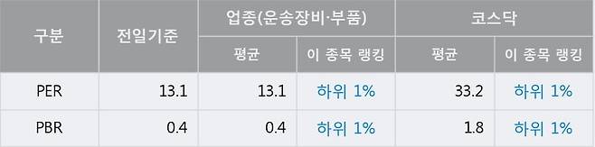 전일 종가를 기준으로 이 종목의 PER는 13.1배, PBR은 0.4배이다. PER는 운송장비·부품업종의 평균 PER 13.1배와 동일한 수준으로 업종 내에서 하위 1%에 있고, PBR은 운송장비·부품업종의 평균 PBR 0.4배와 동일한 수준으로 업종 내에서 하위 1%에 위치한다. 보통 낮은 PER는 현재 시장이 해당 기업의 가치를 상대적으로 낮게 평가하고 있다고 해석될 수 있다.