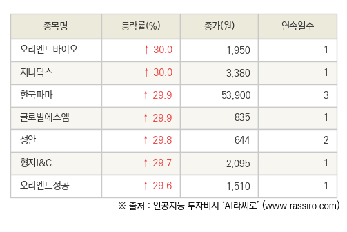 [fnRASSI]오늘의 상한가, 오리엔트바이오 30.0% ↑