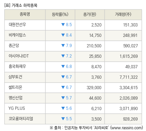 [fnRASSI]장마감, 거래소 하락 종목(대원전선우 -8.5% ↓)