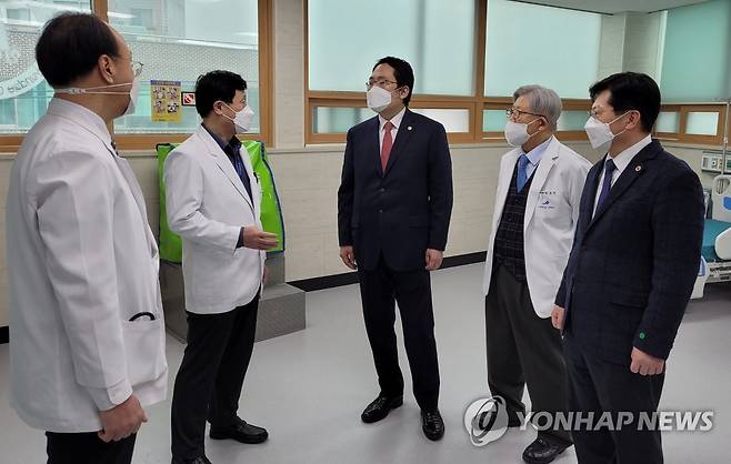 (서울=연합뉴스) 최대집 대한의사협회 회장(가운데)이 15일 코로나19 거점 전담병원인 경기도 남양주 현대병원을 방문해 의료진들을 격려하고 있다. 2021.1.15