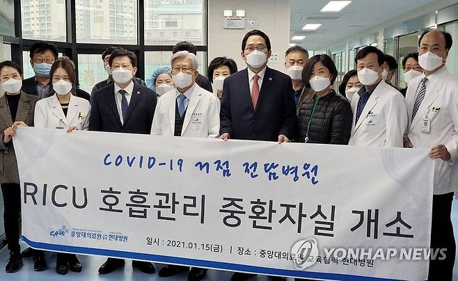 (서울=연합뉴스) 최대집 대한의사협회 회장(앞줄 오른쪽 네번째)이 15일 코로나19 거점 전담병원인 경기도 남양주 현대병원을 방문해 의료진 및 관계자들과 기념촬영을 하고 있다. 2021.1.15