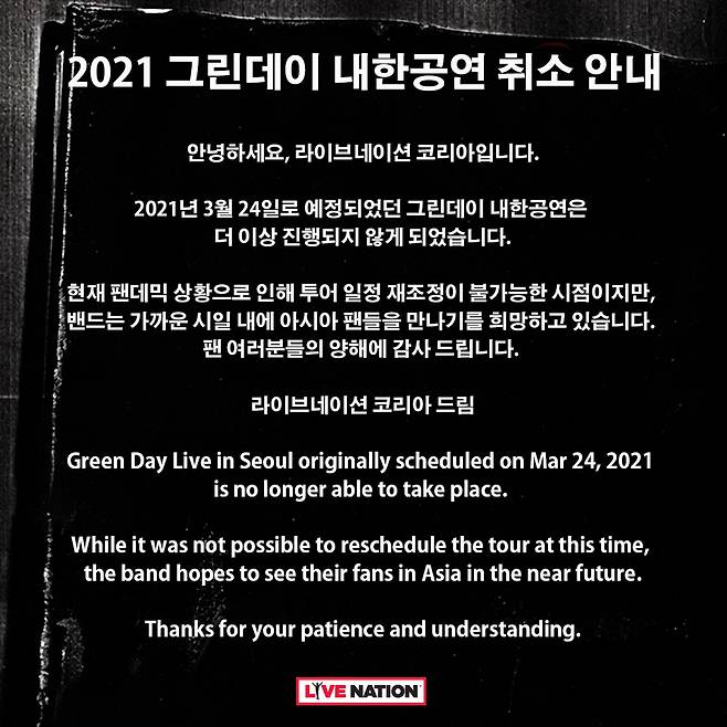 이어 "팬데믹 상황으로 인해 투어 일정 재조정이 불가능한 시점"이라며 "그린데이는 가까운 시일 내에 아시아 팬들을 만나기를 희망하고 있다. 팬 여러분의 양해에 감사드린다"고 덧붙였다.